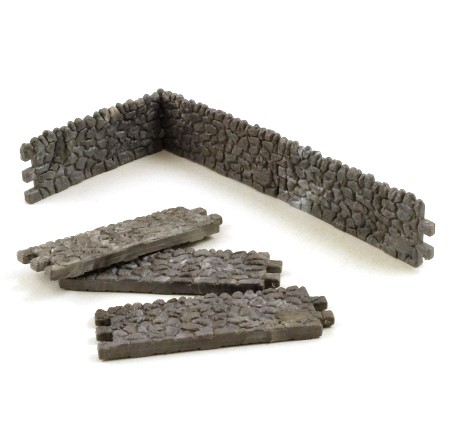 6 interlocking stone wall pieces. The colour of Britains stone walling varies: these ones are mottled in a variety of shades, but are mainly mid-to-dark grey with mottling in various shades..