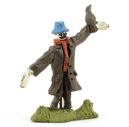 Moulded in dark brown plastic, this scarecrow has a red scarf, blue hat, and white gloves and face. A black crow is sitting on his arm, not looking at all scared! 'Produced by Britains Ltd England' on the underside, with the Herald logo.