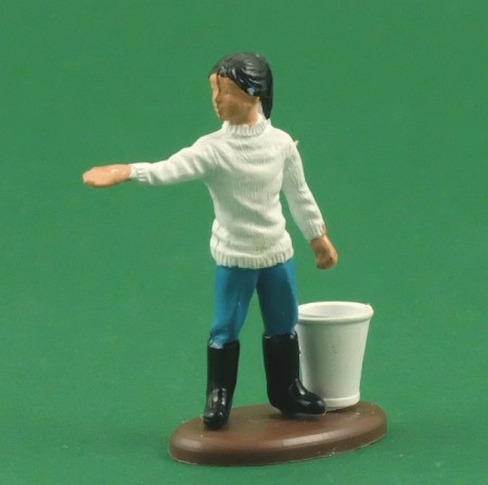 This figure is one of a range of 4 farm children, introduced in 1970 and withdrawn in 1974. She is holding out her hand to feed a horse from the white bucket beside her. She has a white top, blue trousers and black hair and boots. On a separately moulded dark brown base.
