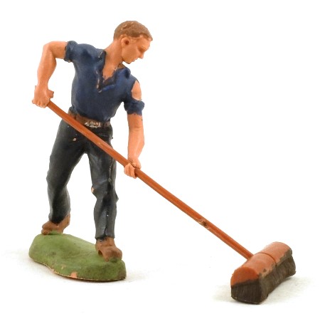Moulded in brown-pink plastic with blue shirt, dark blue-grey trousers, and light brown hair, belt and boots. The belt has a silver buckle. Green base and separate brown broom with dark brown bristles.