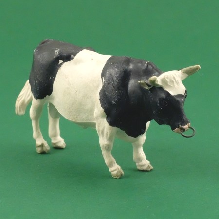 Black and white bull with grey horns and hooves, and pink ears and muzzle. Only slight paint loss, and the nose ring is still present.