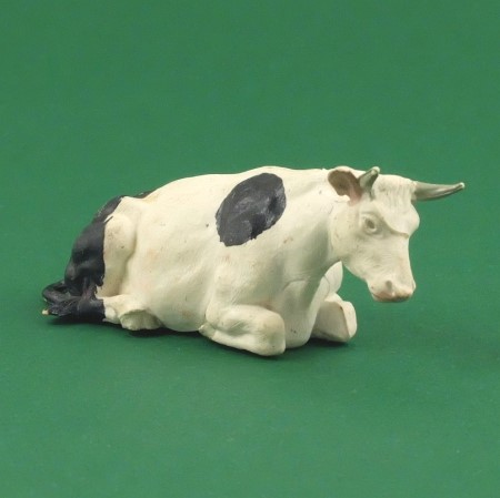 Black and white cow with pink ears and muzzle, and grey horns and hooves. Good condition, a few faint pink surface stains.
