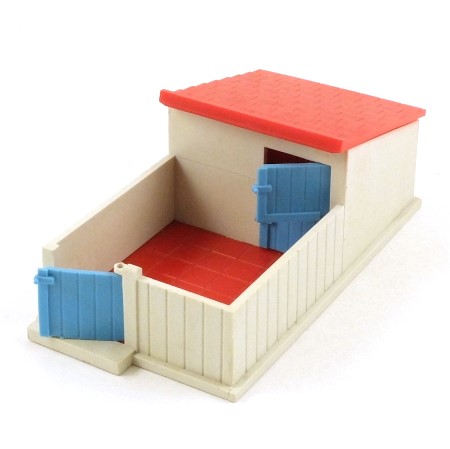 Palle cream-grey, red base and roof, light blue gate, doors and water/feed trough. Opening gate and split doors. Removable roof.