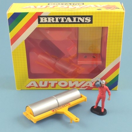 Yellow plastic frame, silver-grey metal rollers with yellow ends. 'AUTOWAY' label. With workman figure in orange overalls carrying a toolbox on his shoulder.