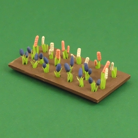 Rectangular flower bed with 11 blue grape hyacinths and 11 pink and white hyacinths. The hyacinths are the earlier type with painted flower heads, and they are in excellent condition with very little paint loss.