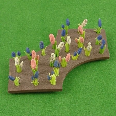 Large flower bed with 12 blue grape hyacinths and 13 pink and white hyacinths. The hyacinths are the earlier type with painted flower heads, and are in excellent condition with very little paint loss. Requires planting tool (available separately).