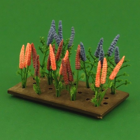 A rectangular bed with an assortment of lupins and delphiniums. These are the later type with separate, self-coloured flower heads. There are 6 delphiniums, 4 with 2 flower heads and 2 with 1. Of the lupins, 4 have 3 heads and 2 have 2.