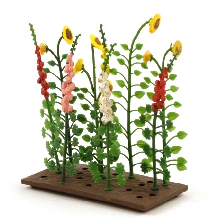 A rectangular flower bed with 4 sunflower plants and 5 hollyhocks in assorted colours.