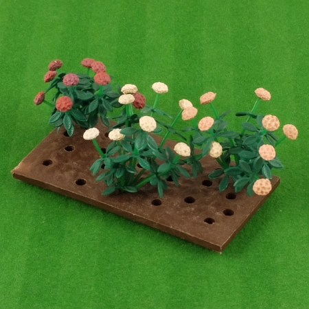 I think these are the most attractive of the Floral Garden flowers, with their dark green stems and separate, lighter green leaves. They also seem to be the least common. Three rhododendron bushes, one with purple flowers, one with white and one with pink. 9 stems per bush, one flower and two leaf clusters per stem. Complete with rectangular bed and in excellent condition.