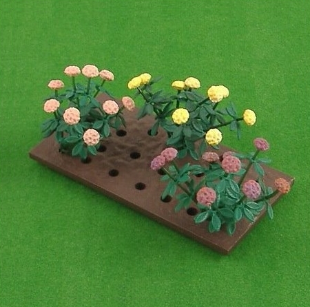 I think these are the most attractive of the Floral Garden flowers, with their dark green stems and separate, lighter green leaves. They also seem to be the least common. Here we have 3 rhododendron bushes in assorted colours, including the rarer yellow. Each bush is complete with 9 stems and 2 sets of leaves on each. Complete with a rectangular bed.