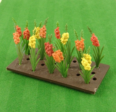 12 Gladioli plants with red, orange and yellow flowers. Complete with a rectangular flower bed. Requires planting tool, available separately.