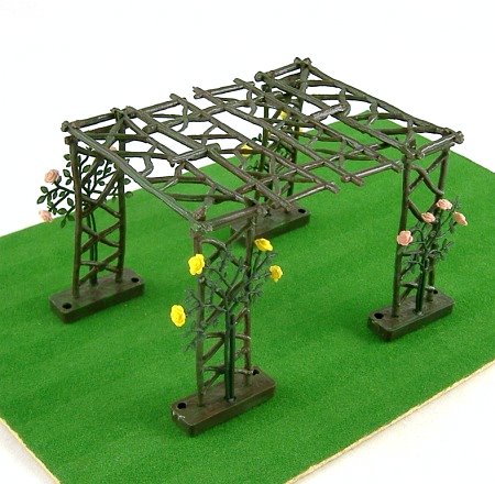This pergola simply clips together as shown, or can be used to make 2 separate arches. Complete with 4 standard roses in yellow and pink, the bases also have 2 extra planting holes each so you can plant extra flowers. Supplied dismantled for easy assembly. Grass not included.