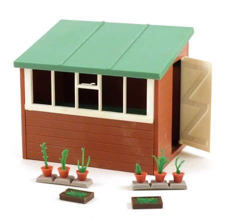 A potting shed for your Floral Garden layout, with removable roof and opening door. This one has a light green roof and shelf, which is quite unusual; they are more commonly very dark green or black.