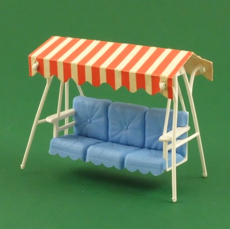 Blue seat and white plastic frame, with red and white striped canopy. This item is very well preserved, with the card canopy showing only slight wear.