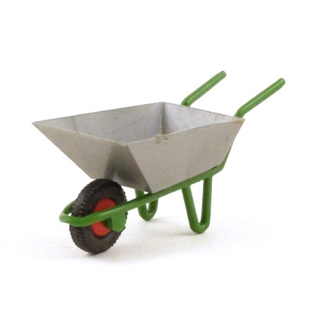 This is the earlier type of wheelbarrow, with a one-piece frame. Good-to-excellent, slight marks on the upper edges of the barrow.