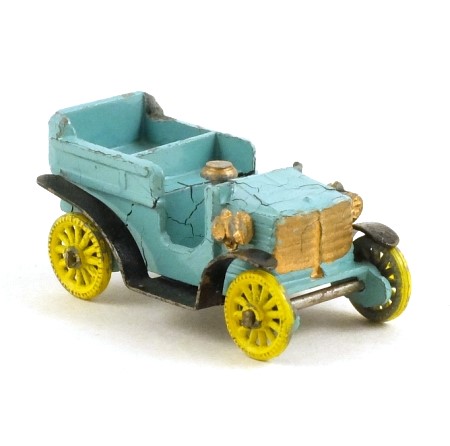 Light blue with chrome or black tinplate mudguards and running boards. Gold grille, headlights and steering wheel. Yellow metal spoked wheels.