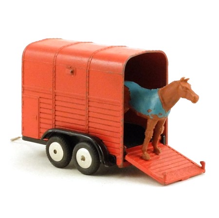 Red with black chassis and mudguards, this twin-axle pony trailer has a drop-down ramp. This is an early release with flat spun hubs and a wire tow bar (later ones were cast metal).