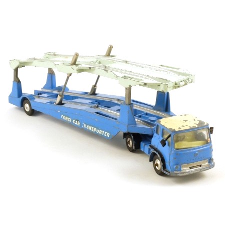 This car transporter is designed to carry four Corgi cars. The Bedford TK tractor unit is normally red, but this one is blue - it probably started life as the tractor unit for Corgi 1131 Machinery Carrier, The cab roof has been repainted cream, and the mudguards black. With silver grille, grey base and pale yellow interior, the cab is fitted with rear view mirrors. The trailer, which can be decoupled from the tractor unit, is blue, grey and silver and has 'Corgi Car Transporter' decals in white on the sides. The upper deck can be lowered. Both tractor and trailer have suspension, with black tyres on spun metal hubs.