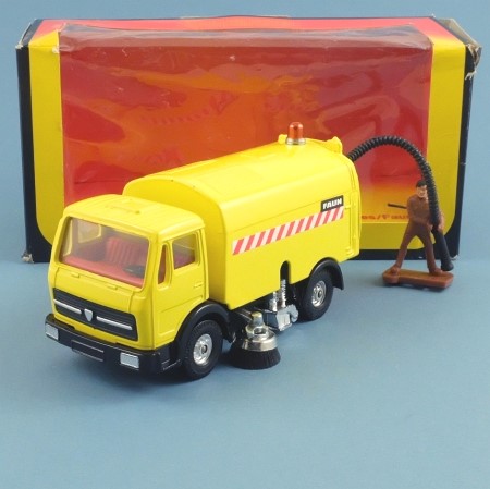 Yellow, black base and grille, red cab interior. 'Faun' and red and white stripe labels on the sides and rear. Rotary brush may be swung out. Rear hose may be stowed or held by the operator figure supplied. Amber roof light at rear.