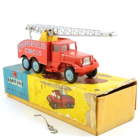 This classic Corgi model was the first of the Corgi Chipperfields Circus models, introduced in 1960. Based on an International 6x6 truck, this vehicle is finished in red with raised blue lettering and blue metal wheels. The crane mechanism has a yellow housing with a silver-grey tinplate jib and silver metal hook. The hook can be raised and lowered by turning the handle at the rear, and the jib can also be raised and lowered with the spring-loaded rear 'ratchet'. All six wheels have suspension, and the truck is equipped with a plastic tow hook for towing the 1123 Circus Cage, with which it formed Gift Set 12.