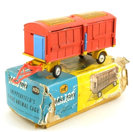 This model is designed to complement the 1121 Chipperfields Crane Truck, with which it forms Gift Set 12. Red body and yellow chassis, red metal 2-part opening sides revealing unpainted metal bars. 'CHIPPERFIELDS' raised lettering on the other side. The sliding end doors and central divider are in blue plastic and the roof lights are amber tinted. The front wheels swivel and all wheels have suspension. The drawbar is in red plastic, and there is a tow hook at the rear so that further trailers can be added!