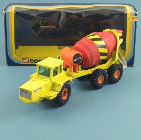 Yellow, with red plastic mixer barrel. Tractor has detailed grille, 'VOLVO BM' labels, black exhaust and steps, and green tinted windows. The coupling to the mixer is articulated. The mixer barrel rotates when the model is pushed along; this feature can be turned on and off by a lever at the side. Orange plastic motor housing and input hopper, silver metal swivelling output chute. 'RAPIER' label on the motor housing and a yellow and black striped band on the barrel. Orange metal wheels with black tyres.