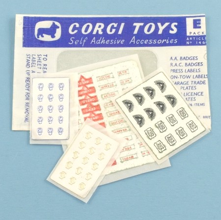 Envelope containing self-adhesive stickers for applying to Corgi vehicles: