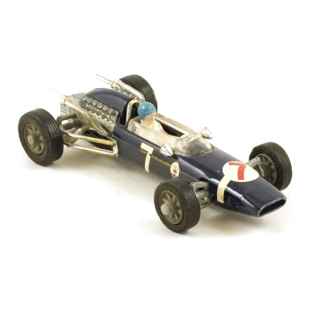 A smart-looking formula one racing car, this model is in dark blue with silver engine, exhaust, mirrors and working suspension. Cooper and Maserati logos are cast into the base. With white nose stripe and racing number 7 in red, with white racing numbers and Maserati logos on the sides. Wheels are cast metal.