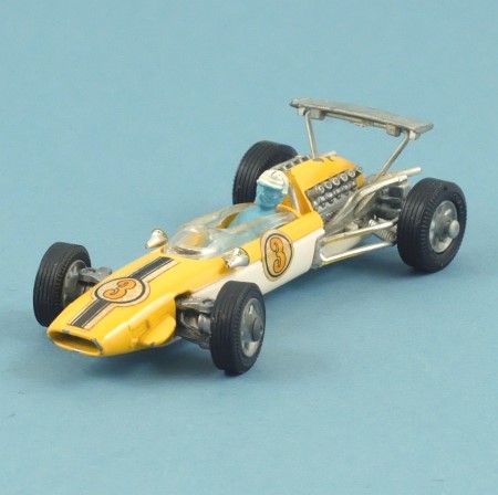Yellow and white racing car with blue driver with white helmet. Racing number 3 and bonnet stripe labels in white, black and yellow. Nice detailing of engine and suspension in a combination of silver metal and plastic parts, including a tiltable rear wing. The front wheels steer realistically when the driver is tilted to one side.