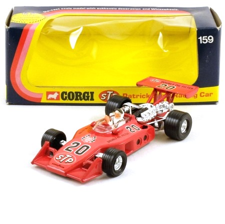 Red, with chrome engine and suspension parts. Orange labels with racing number 20, 'STP' logos and 'DOUBLE OIL FILTER'. Complete with nicely-detailed driver figure. Clear windscreen and black wheels with silver centres.