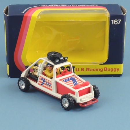 Red with white frame and gold plated engine with silver air intake and black exhausts. Bonnet and side labels in red, white and blue, with stars and stripes and racing number 7. Driver and co-driver figures in yellow overalls and blue helmets. Roof-mounted spare tyre and light.