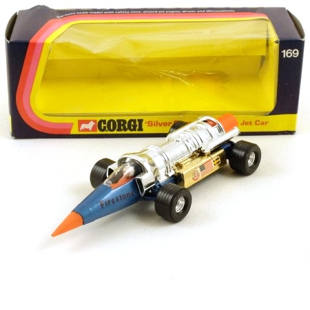 This is a model of a car built by Arnold Sundquist of Sweden, powered by a Starfighter jet engine. Metallic blue, with orange nose cone and exhaust nozzle, silver plated engine and gold plated fuel tanks. Clear cockpit canopy and driver with white helmet and orange overalls. 'Firestone' labels on the cockpit sides, and sponsor labels on the fuel tanks, one side featuring US and Swedish flags. Wide Whizzwheels with silver centres.