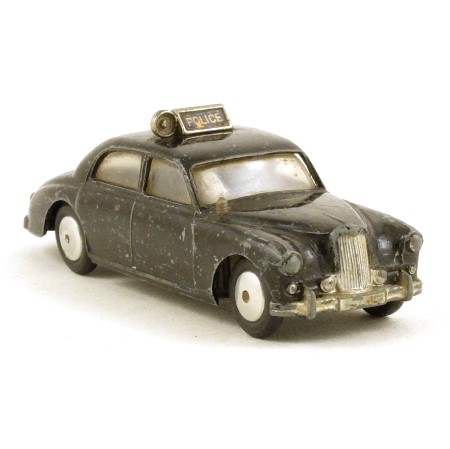 Black with silver grille, headlights and bumpers. Black tinplate base. Diecast roof sign with 'police' labels front and back, and a siren on one side. There should be a bell on the other side, but it is missing, as is the plastic aerial on the front wing. Smooth spun metal wheels with black tyres.
