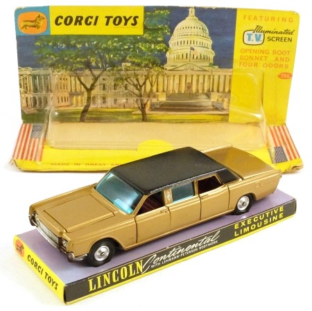 Metallic gold, black roof, chrome plated bumpers and grille, grey base. All four doors open to reveal a red interior with purple carpet, and equipped with an AAA battery-operated TV screen. A strip of pictorial colour transparencies is supplied to slot into the TV screen, which illuminates when a switch on the base is turned on. In addition the model has an opening boot, also carpeted, and opening bonnet with detailed engine. Twin jewelled headlamps are fitted, and the windows are blue tinted. There is no rear window glazing, in order to give an unrestricted view of the TV screen. The wheels are spun metal with black tyres and suspension.