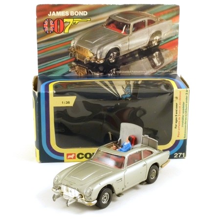 Silver body and base, gold grille and silver bumpers, red interior with James Bond figure at the wheel. Ejector seat which launches 'baddie' through the roof when a tab on the side is pressed. Pressing another tab extends the front overriders and guns. Pressing the rear overriders makes the rear bullet shield spring up. The wheels have 4-spoke 'alloy' centres.
