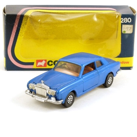 Metallic blue, light grey base, silver metal grille, headlights and bumpers. The bonnet opens to reveal a detailed engine, silver plated and black. There are four jewelled headlights at the front and the rear lights are picked out in red. The boot also opens.