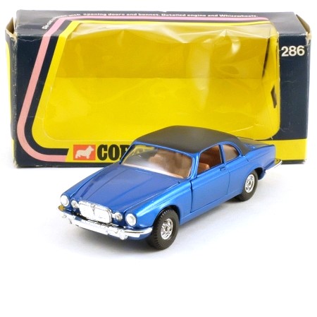 This Jaguar is in smart pearlescent blue, with black roof and chrome bumpers and grille. Opening doors, revealing a brown interior with black steering wheel. The opening bonnet reveals a detailed chrome and black engine. This model is fitted with a black plastic tow bar, and has Whizzwheels with detailed silver centres.