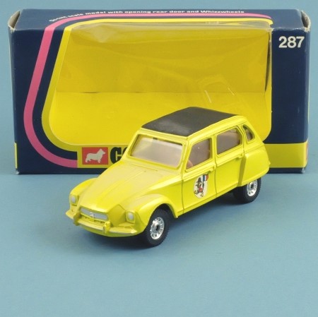 Metallic yellow, black roof and base. Silver headlights and grille and red rear lights. Tow hook and opening tailgate. Labels on the driver's door and tailgate bear the slightly troubling image of a duck wearing a Napoleonic military uniform and holding a French flag. The rear tailgate opens, revealing a detailed brown interior. The black wheels have silver centres and suspension, and the model is equipped with a grey plastic tow hook.