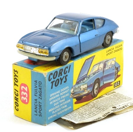 In metallic blue with silver plated bumpers and grille, red rear lights and 'glazed' yellow headlamps. The doors open and the interior is nicely detailed in a lighter blue with grey steering wheel and tipping front seats. The side-hinged bonnet opens to reveal a detailed plated engine. The wheels are the cast detailed type with black 'Corgi Toys' tyres and suspension.