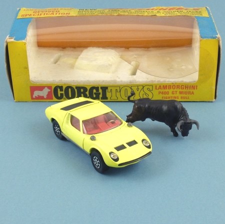 In bright fluorescent yellow with red interior, this model certainly catches the eye! With jewelled headlights, the front hinges forward to reveal the spare wheel. The rear engine cover opens as well, revealing the silver and gold transverse V12 engine. There is also a luggage compartment with opening lid built into the rear body section. The Corgi Lamborghini Miura was originally released with 'Golden Jacks' and take-off wheels, but these were soon replaced by the Whizz Wheels fitted to this example. Corgi needed to use up the stock of original boxes, so stickers were applied appropriate to the new specification.
