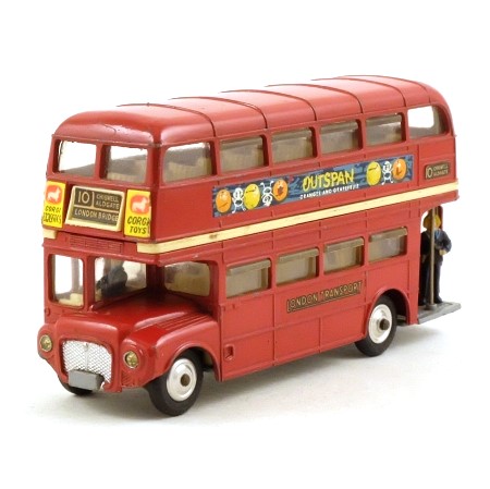This classic London double-decker bus is red with silver grille and grey base. The interior is cream, with the plastic moulding also forming the central body stripe and front destination board frame. The interior features yellow stairs, a driver at the front, and 'Clippie' (conductor) standing on the platform at the back. With 'OUTSPAN ORANGES' and 'London Transport' decals on the sides, and destination boards front and rear showing route 10, LONDON BRIDGE via Chigwell and Aldgate. There are also 2 small Corgi advert labels on the front. This is an earlier version with jewelled headlamps. The wheels are spun metal with black tyres and suspension.
