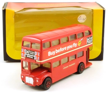 Red, with white interior and strip separating upper and lower decks. Black plastic base. 'But before you fly' advert on one upper deck side, and 'Old Holborn' on the other. Route 24 'SPECIAL' via Victoria Street' destination boards, flanked by Union flags at the front and rear. 'LONDON TRANSPORT' labels in gold lettering on the lower deck sides. Whizzwheels with red centres.