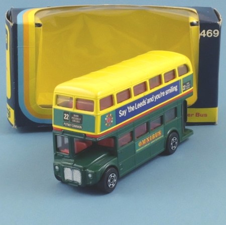 Dark green lower deck, yellow upper deck. Red interior and stripe. Silver grille and headlights, black plastic base. 'LEEDS PERMANENT BUILDING SOCIETY' and 'Say 'the Leeds' and you're smiling' adverts on the upper deck sides with logos, Route 22 'PUTNEY COMMON' destination boards. Whizzwheels with silver centre pattern.