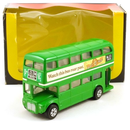 Green, with silver grille and headlights, and off-white interior and strip separating upper and lower decks. Black plastic base. 'Watch this bus roar past' Lion Bar adverts on the upper deck sides. Route 14 'HIGH ST SPECIAL' destination boards, flanked by 'Kelly Girl' ads at the front and rear. 'LONDON TRANSPORT' labels in gold lettering on the lower deck sides. Whizzwheels with silver plated centres.