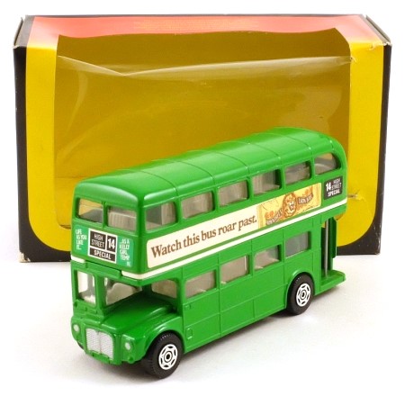 Green, with silver grille and headlights, and off-white interior and strip separating upper and lower decks. Black plastic base. 'Watch this bus roar past' Lion Bar adverts on the upper deck sides. Route 14 'HIGH ST SPECIAL' destination boards, flanked by 'Kelly Girl' ads at the front and rear. 'LONDON TRANSPORT' labels in gold lettering on the lower deck sides. Whizzwheels with silver plated centres.