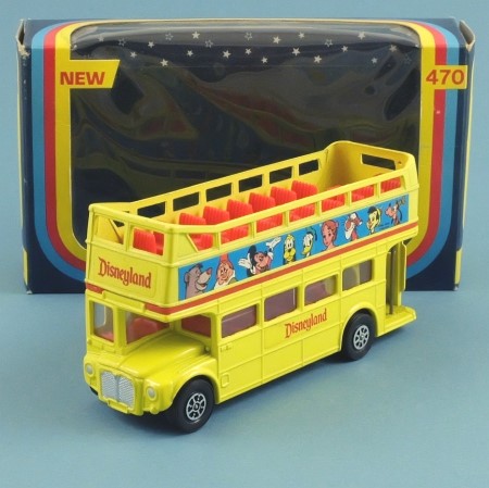 Yellow open-top Routemaster bus with red interior and black base. 'Disneyland' labels in red on a transparent background on the lower deck sides, and upper deck front and rear. Labels on the upper deck sides show 9 assorted Disney characters on a blue background. The Whizzwheels have silver plated centres.