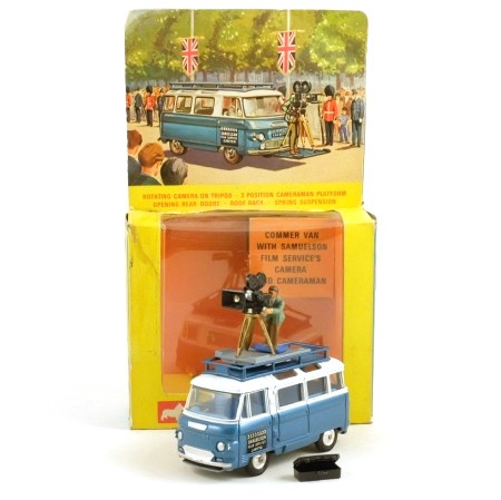 This unusual model is finished in metallic blue and white with silver trim to the headlights, grille and bumpers and grey base. The interior is blue with silver-grey steering wheel. The rear doors open and are flanked by red tail lights. The front doors have labels reading 'Samuelson Film Service Limited'. The model comes with a grey metal camera platform with a beautifully cast camera on tripod, fitted with a jewelled lens. This can be swivelled from side to side and is complemented by a plastic cameraman figure. The platform can be mounted in 3 positions: on the roof, on the front or on the rear of the vehicle. The wheels are the earlier shaped spun type with suspension.