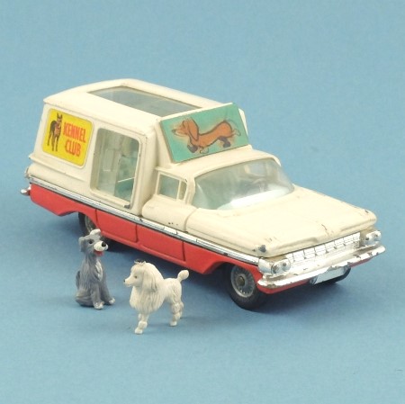 This model was adapted from the Corgi 248 Chevrolet Impala, which has 2 separate castings for the upper and lower body, with a plastic chrome trim unit sandwiched in between. For the Kennel Service Wagon, an entirely new upper body section was produced, incorporating a van-like rear with clear plastic roof light and sliding side windows, and drop-down tailgate. The upper part of the body is white, while the lower portion including base is orange-red.