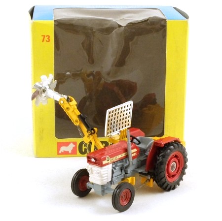 This ingenious model was based on the Corgi 66 Massey-Ferguson tractor, with the addition of a working circular saw attachment. The model is finished in the Massey-Ferguson colours of red and grey, with shite radiator grille and silver headlights. It has a black steering wheel, silver plastic exhaust stack, and Massey-Ferguson decals on the engine cover sides.