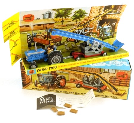 This set contains a No.67 Ford 5000 Super Major Tractor, and a trailer with operating conveyor belt. The tractor is blue with light grey rear mudguards and grey plastic grille and exhaust. Twin jewelled headlights are mounted in the grille, and there are 'Ford Super Major' decals on the sides of the engine cover. The model has working steering, and a silver metal lever-operated linkage and pick-up hitch at the rear.